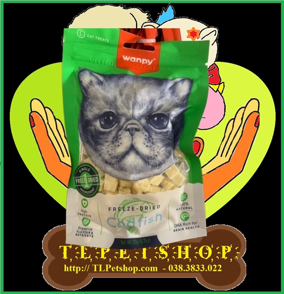 - Ca tuyết sấy Wanpy 20g" là món ăn vặt dành cho mèo từ thương hiệu Wanpy, được làm từ cá tuyết chất lượng cao, sấy thăng hoa để giữ nguyên dinh dưỡng và hương vị tự nhiên, cung cấp protein, giúp hỗ trợ phát triển cơ thể, duy trì da và lông khỏe mạnh cho mèo. Sản phẩm có nguồn gốc tự nhiên, đạt tiêu chuẩn thức ăn cho người, không chứa chất bảo quản hay hương liệu nhân tạo, là lựa chọn dinh dưỡng và lành mạnh cho mèo. Đặc điểm chính