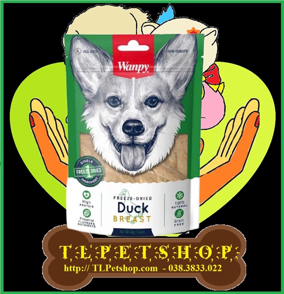 - Ức vịt sấy thăng hoa Wanpy là sản phẩm thức ăn vặt (snack) cao cấp dành cho chó mèo của thương hiệu Wanpy, được chế biến bằng công nghệ sấy thăng hoa hiện đại, giúp giữ trọn dinh dưỡng và hương vị tự nhiên của thịt vịt. Sản phẩm có thành phần 100% tự nhiên, không chứa ngũ cốc hay hương liệu nhân tạo, cung cấp protein chất lượng cao, hỗ trợ bổ sung dinh dưỡng và năng lượng cho thú cưng. Đặc điểm nổi bật